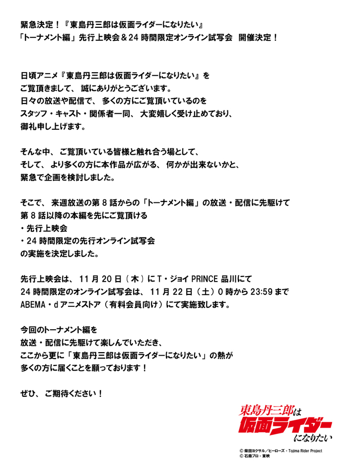 緊急開催!『東島丹三郎は仮面ライダーになりたい』トーナメント編 開幕!!!オンライン試写会