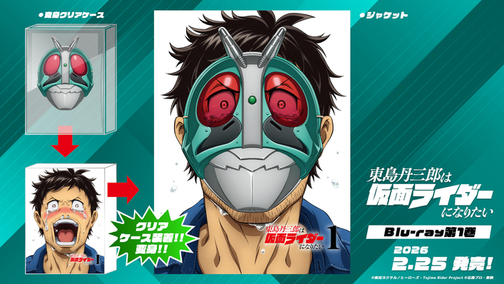 Blu-ray&DVD第1巻ジャケットが公開となりました。第1巻表紙は、主人公東島丹三郎が描かれており、“変身”クリアケース仕様にて、仮面ライダー1号のお面が描かれた透明のケースを、デジジャケットに装着することで、変身できるような仕組み。