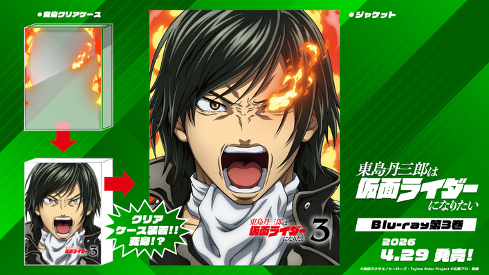 Blu-ray&DVDの、第3巻ジャケットが公開となりました。第3巻の表紙は、メインキャラクターの島村一葉が描かれており、“変身”クリアケース仕様にて、炎が描かれた透明のケースを、デジジャケットに装着することで、変身!?できる仕組みです!